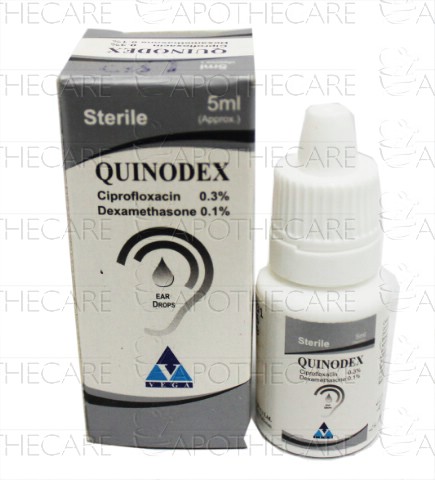 Product Name: Quinodex Ear Drops 5mlProduct Form: DropsPack Size: 5mlMarketed By: Vega Pharmaceuticals (Pvt.) Ltd.Generic Category: Anti-infective / corticosteroidIngredients: Ciprofloxacin 3mg, Dexamethasone 1mg