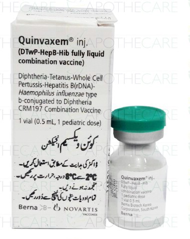 Product Name: Quinvaxem Inj 0.5ml 1VialProduct Form: Injection Pack Size: 1VialMarketed By: NOVARTIS PHARMA PAKISTAN LTDGeneric Category: VaccineIngredients: Diphtheria, Tetanus, Acellular Pertussis (DPT), Hepatitis B Recombinant, Conjucated Haemophilus Influenza type B Vaccine (HIB)Storage Condition: Store at 2 - 80C (Do not freeze)