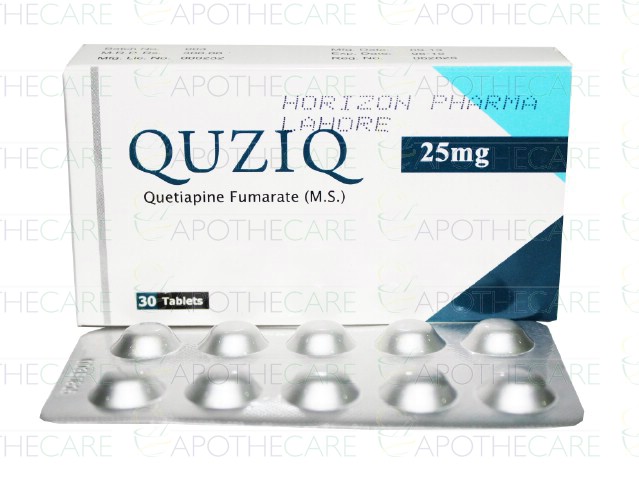 Product Name: Quziq Tab 25mg 3x10'sProduct Form: TabletsPack Size: 3x10'sMarketed By: Wilshire Laboratories (Pvt) LtdGeneric Category: PsychosisIngredients: Quetiapine Fumarate