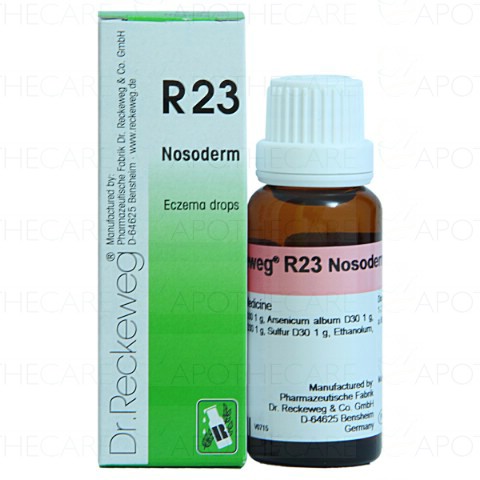 Product Name: R-23 Eczema Drops (Nosoderm) 22mlProduct Form: DropsPack Size: 22mlIndications: Acute & Chronic Eczema, pimples, herpes, rashes eschar. Dosage : 10-15 drops in little water for a longer period.