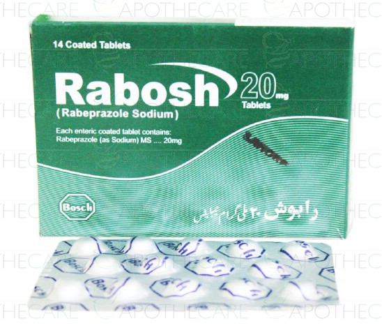 Product Name: Rabosh Tab 20mg 14'sProduct Form: TabletsPack Size: 14'sMarketed By: BOSCH PHARMACEUTICALS (PVT) LTDGeneric Category: ANTI-ULCERANTIngredients: Rabeprazole