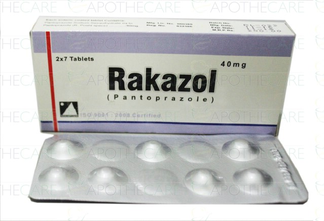 Product Name: Rakazol Tab 40mg 14'sProduct Form: TabletsPack Size: 14'sMarketed By: Rakaposhi PharmaceuticalsGeneric Category: Anti-ulcerantIngredients: PANTOPRAZOLE 40mg