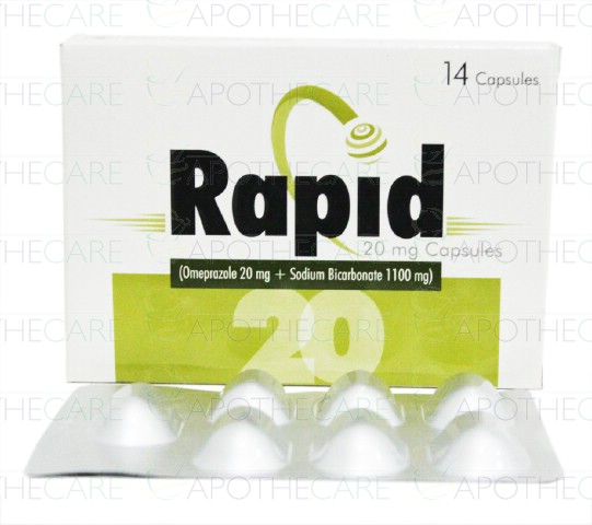 Product Name: Rapid Cap 20mg/1100mg 14'sProduct Form: CapsulesPack Size: 14'sMarketed By: GLOBAL PHARMAGeneric Category: ANTI-ULCERANTIngredients: Omeprazole 20mg, Sodium bicarbonate 1100mg