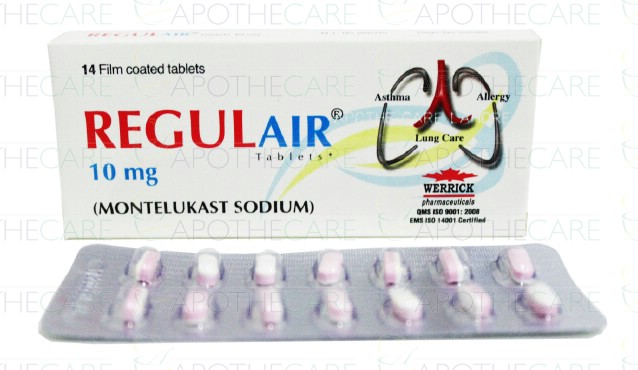 Product Name: Regulair Tab 10mg 14'sProduct Form: TabletsPack Size: 14'sMarketed By: Werrick PharmaceuticalsGeneric Category: Anti-LeukotrieneIngredients: Montelukast Sodium