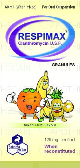 Product Name: Respimax Dry Susp 125mg/5ml 60mlProduct Form: SuspensionPack Size: 60mlMarketed By: SCHAZOO ZAKA (PVT) LTDGeneric Category: MACROLIDE ANTI-BACTERIALIngredients: Clarithromycin