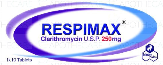 Product Name: RESPIMAX Tab 250mg 1x10'sProduct Form: TabletsPack Size: 1x10'sMarketed By: SCHAZOO ZAKA (PVT) LTDGeneric Category: MACROLIDE ANTI-BACTERIALIngredients: Clarithromycin