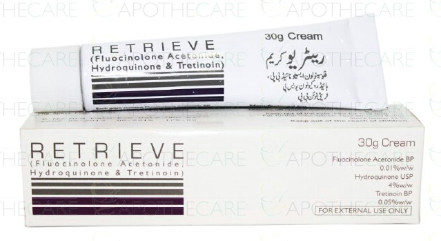 Product Name: Retrieve Cream 30gmProduct Form: CreamPack Size: 30gmMarketed By: PHARMA HEALTH PAKISTAN (PVT.) LTDGeneric Category: Skin care preparationIngredients: Fluocinolone Acetonide 0.01%, Hydroquinone 4%, Tretinoin 0.05%