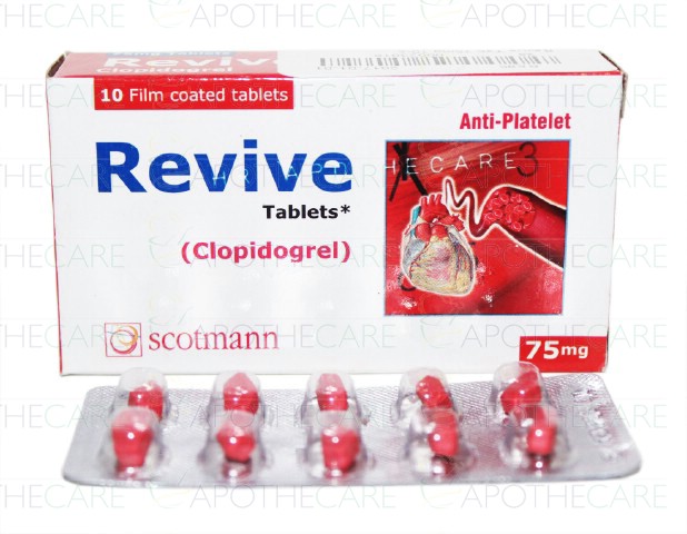 Product Name: Revive Tab 75mg 10'sProduct Form: TabletsPack Size: 10'sMarketed By: Scotmann PharmaceuticalsGeneric Category: Anti-Platelet AggregationIngredients: Clopidogrel