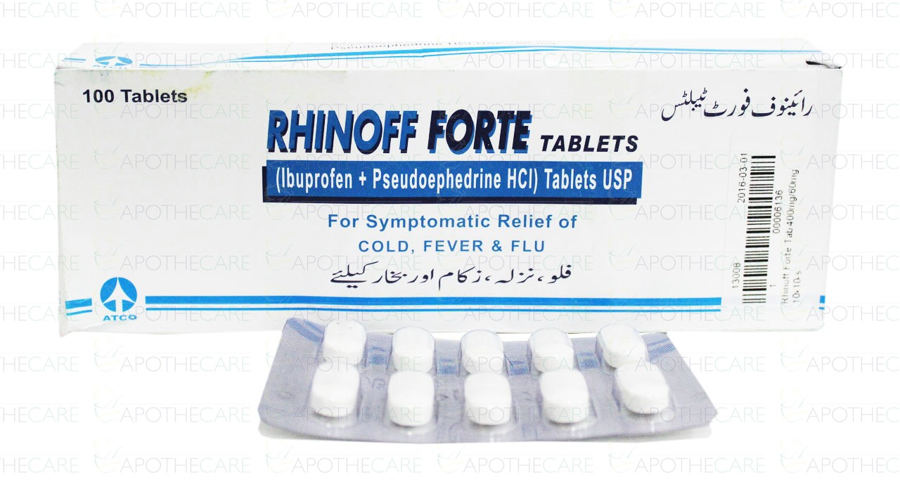 Product Name: Rhinoff Forte Tab 400mg/60mg 10x10'sProduct Form: TabletsPack Size: 10x10'sMarketed By: ATCO LABORATORIES (PVT) LTDGeneric Category: Cold preparation without Anti-infectivesIngredients: Ibuprofen 400mg ,Pseudoephedrine HCl 60mg