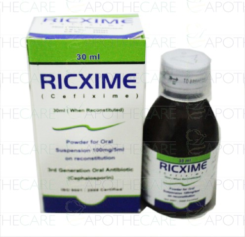Product Name: Ricxime Dry Susp 100mg/5ml 30ml 216 PacksProduct Form: SuspensionPack Size: 216 Packs of 30mlMarketed By: Rakaposhi PharmaceuticalsGeneric Category: Cephalosporin AntibioticIngredients: Cefixime