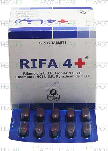 Product Name: Rifa 4 Plus Tab 10x10'sProduct Form: TabletsPack Size: 10x10'sMarketed By: SCHAZOO ZAKA (PVT) LTDGeneric Category: Anti-TubercularIngredients: Rifampicin 150mg, Ethambutol 275mg, Isoniazid 75mg, Pyrazinamide 400mg