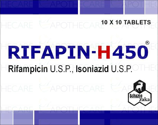 Product Name: Rifapin-H 450 Tab 10x10'sProduct Form: TabletsPack Size: 10x10'sMarketed By: SCHAZOO ZAKA (PVT) LTDGeneric Category: ANTI-TUBERCULARIngredients: Rifampicin 450mg,Isoniazid 300mg