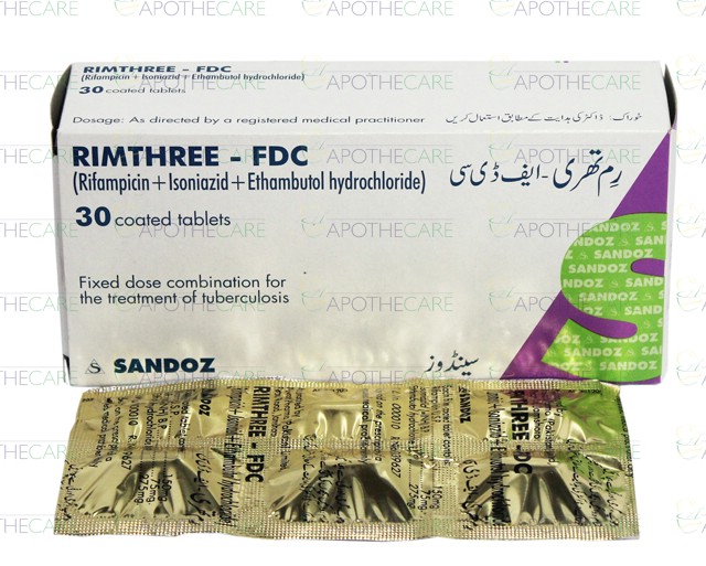 Product Name: Rimthree-FDC Tab 30's Product Form: TabletsPack Size: 30's Marketed By: NOVARTIS PHARMA PAKISTAN LTDGeneric Category: Anti-TubercularIngredients: Rifampicin 150mg, Isoniazid 75mg, Ethambutol 275mg