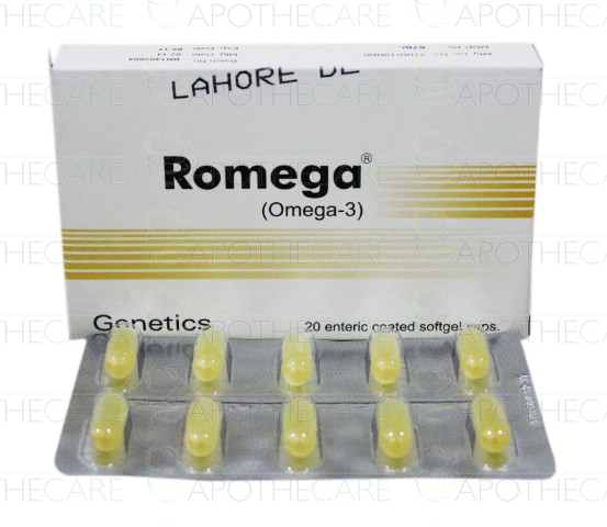 Product Name: Romega Cap 1000mg 20'sProduct Form: CapsulesPack Size: 20'sMarketed By: Genetics PharmaceuticalsGeneric Category: Nutritional SupplementIngredients: Omega-3
