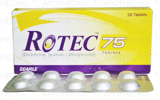 Product Name: Rotec-75 Tab 75mg/200mcg 10'sProduct Form: TabletsPack Size: 10'sMarketed By: SEARLE PAKISTAN Generic Category: NSAID induced ulcerIngredients: Diclofenac Sodium 75mg, Misoprostol 200mcg