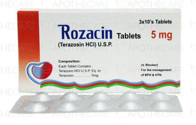 Product Name: Rozacin Tab 5mg 3x10'sProduct Form: TabletPack Size: 3x10'sMarketed By: GLOBAL PHARMAGeneric Category: BENIGN PROSTATE HYPERTROPHYIngredients: Terazosin Hcl