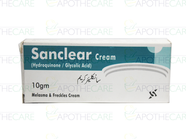 Product Name: Sanclear Cream 10gProduct Form: CreamPack Size: 10gMarketed By: Sante pharmaGeneric Category: Skin Care PreparationIngredients: Hydroquinone 4%, Glycolic Acid 1%