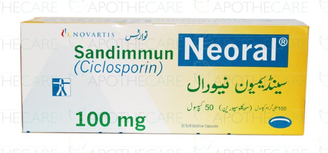 Product Name: Sandimmun Neoral Cap 100mg 50's Product Form: CapsulesPack Size: 50's Marketed By: NOVARTIS PHARMA PAKISTAN LTDGeneric Category: ImmunosuppressantIngredients: Cyclosporin