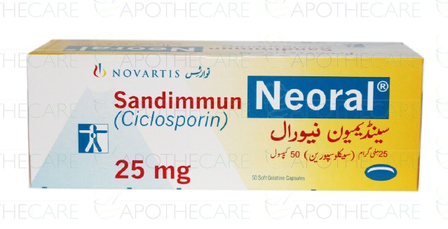 Product Name: Sandimmun Neoral Cap 25mg 50's Product Form: CapsulesPack Size: 50's Marketed By: NOVARTIS PHARMA PAKISTAN LTDGeneric Category: ImmunosuppressantIngredients: Cyclosporin