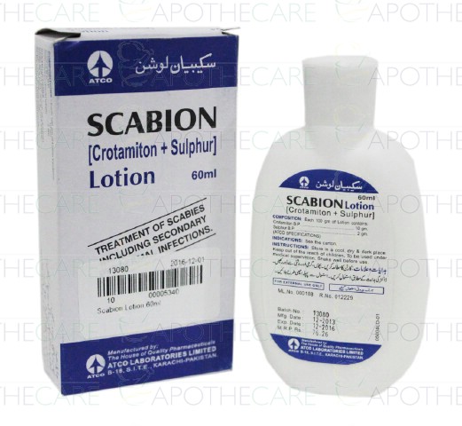 Product Name: Scabion Lotion 60mlProduct Form: LotionPack Size: 60mlMarketed By: ATCO LABORATORIES (PVT) LTDGeneric Category: ScabicideIngredients: Each 100gm of Lotion Contains:Crotamiton 10gm, Sulphur 2gm