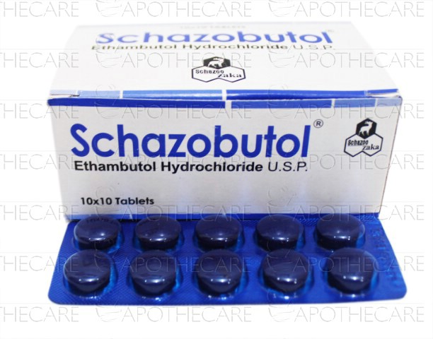 Product Name: Schazobutol Tab 400mg 10x10'sProduct Form: TabletsPack Size: 10x10'sMarketed By: SCHAZOO ZAKA (PVT) LTDGeneric Category: Anti-Tubercular Ingredients: Ethambutol 400mg