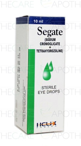 Product Name: Segate Eye Drops 10mlProduct Form: DropsPack Size: 10mlMarketed By: Helix Pharma (Pvt) LtdGeneric Category: Allergic ConjunctivitisIngredients: Sodium Chromoglycate 40mg ,Tetrahydrazoline 0.5mg