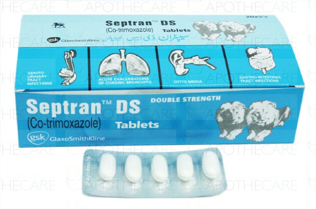 Product Name: Septran DS Tab 800mg/160mg 5'sProduct Form: TabletsPack Size: 5'sMarketed By: Glaxosmithkline Pakistan LimitedGeneric Category: ANTI-BACTERIALIngredients: Sulfamethoxazole 800mg,Trimethoprim 160mg