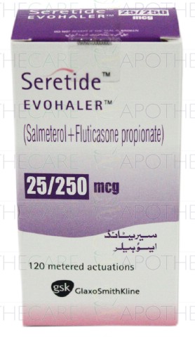 Product Name: Seretide MDI Inh 25mcg/250mcg 1'sProduct Form: InhalerPack Size: 1'sMarketed By: Glaxosmithkline Pakistan LimitedGeneric Category: B2-STIMULANT + CORTICOSTEROID Ingredients: Salmeterol 25mcg, Fluticasone 250mcg