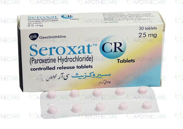 Product Name: Seroxat CR Tab 25mg 30'sProduct Form: TabletsPack Size: 30'sMarketed By: Glaxosmithkline Pakistan LimitedGeneric Category: Anti-DepressantIngredients: Paroxetine