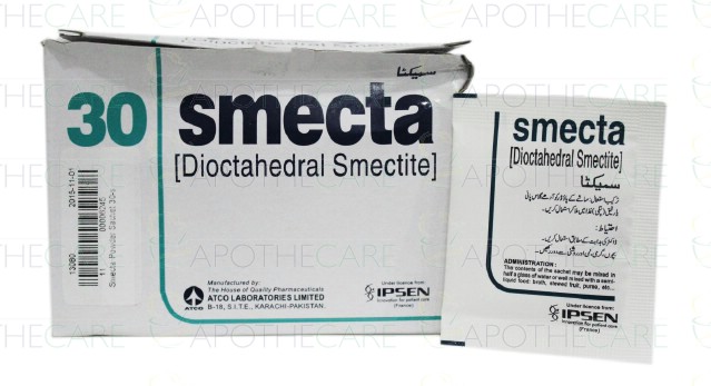 Product Name: Smecta Powder Sachet 30'sProduct Form: PowderPack Size: 30's Marketed By: ATCO LABORATORIES (PVT) LTDGeneric Category: Anti-Diarrheal Ingredients: Dioctahedral Smectite