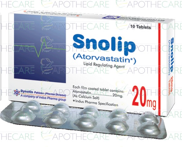 Product Name: SNOLIP Tab 20mg 10'sProduct Form: TabletPack Size: 10'sMarketed By: INDUS PHARMA (PVT) LTDGeneric Category: STATINSIngredients: Atorvastatin