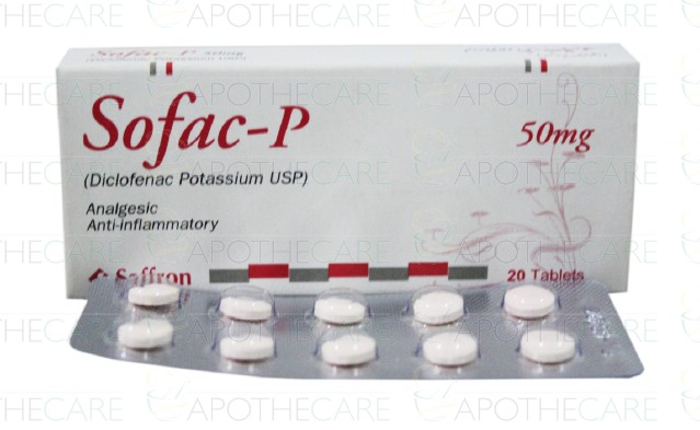 Product Name: Sofac- P Tab 50mg 2x10'sProduct Form: TabletsPack Size: 2x10'sMarketed By: Saffron Pharmaceuticals (Pvt) Ltd.Generic Category: NSAID Ingredients: Diclofenac Potassium