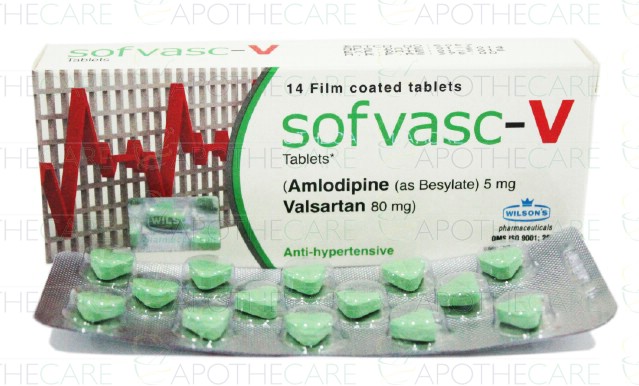 Product Name: Sofvasc-V Tab 5mg/80mg 14'sProduct Form: TabletsPack Size: 14'sMarketed By: WILSON'S PHARMACEUTICALSGeneric Category: Anti-HypertensiveIngredients: Amlodipine Besylate 5mg, Valsartan 80mg
