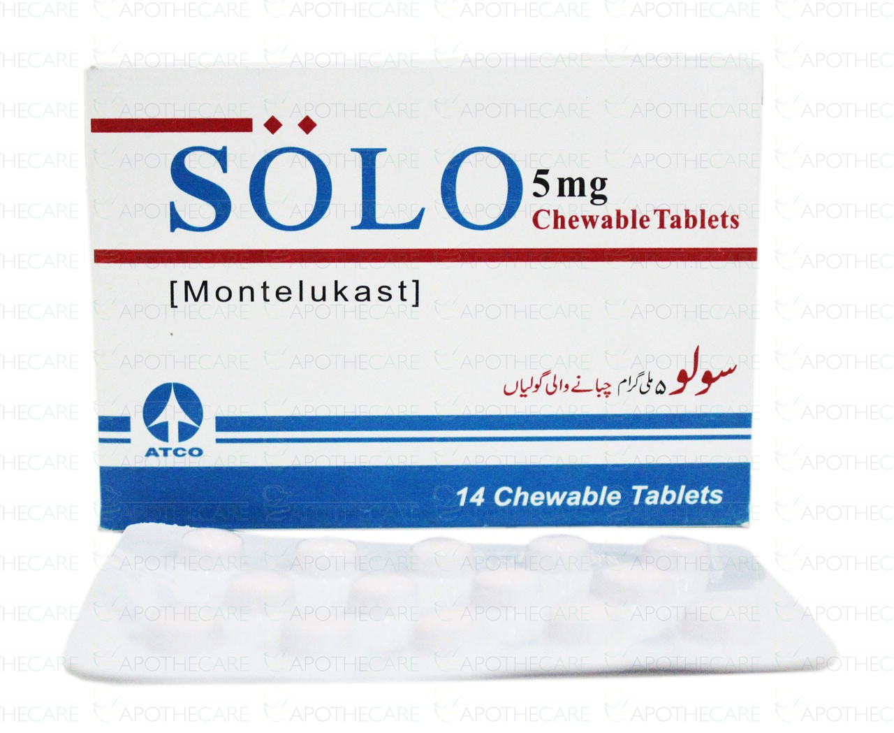 Product Name: Solo Chewable Tab 5mg 1x14'sProduct Form: TabletsPack Size: 1x14'sMarketed By: ATCO LABORATORIES (PVT) LTDGeneric Category: Anti-LeukotrieneIngredients: Montelukast Sodium