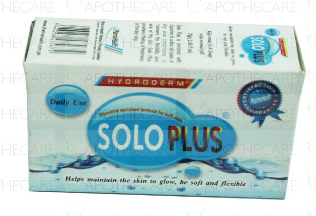 Product Name: SOLO PLUS BAR 75gmProduct Form: SoapPack Size: 75gMarketed By: PHARMA HEALTH PAKISTAN (PVT.) LTDGeneric Category: Skin care preparationIngredients: Glycerin Enriched soap for all Types of dry skins