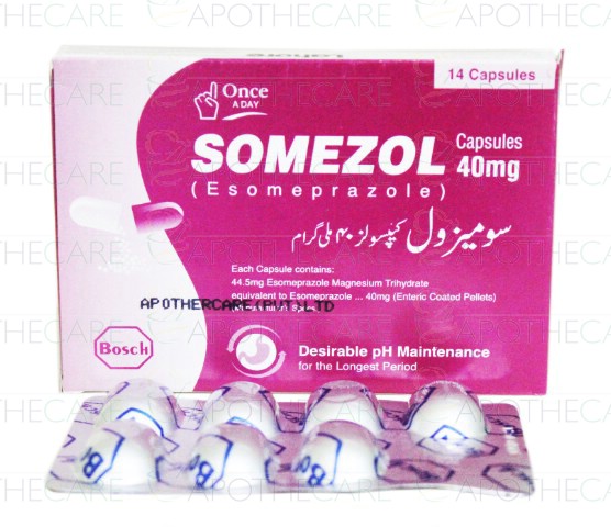 Product Name: Somezol Cap 40mg 2x7'sProduct Form: CapsulesPack Size: 2x7'sMarketed By: BOSCH PHARMACEUTICALS (PVT) LTDGeneric Category: ANTI-ULCERANTIngredients: Esomeprazole