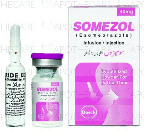 Product Name: Somezol Inj 40mg 1VialProduct Form: Injection Pack Size: 1VialMarketed By: BOSCH PHARMACEUTICALS (PVT) LTDGeneric Category: ANTI-ULCERANTIngredients: Esomeprazole