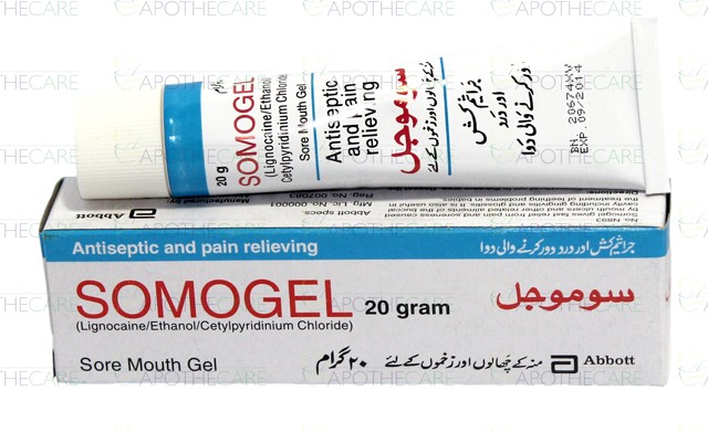Product Name: Somogel Gel 20gmProduct Form: GelPack Size: 20gmMarketed By: ABBOTT LABORATORIES (PAKISTAN) LTDGeneric Category: Local AnestheticIngredients: Lignocaine (Base) 0.60% w/w, Menthol 0.06% w/w, Eucalyptol 0.10% v/w, Cetylpyridinium chloride 0.02% w/w, Ethanol 33% v/w