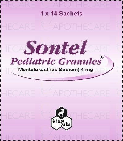 Product Name: Sontel Powder Sachet 4mg 1x14'sProduct Form: PowderPack Size: 1x14'sMarketed By: SCHAZOO ZAKA (PVT) LTDGeneric Category: Anti-LeukotrieneIngredients: Montelukast