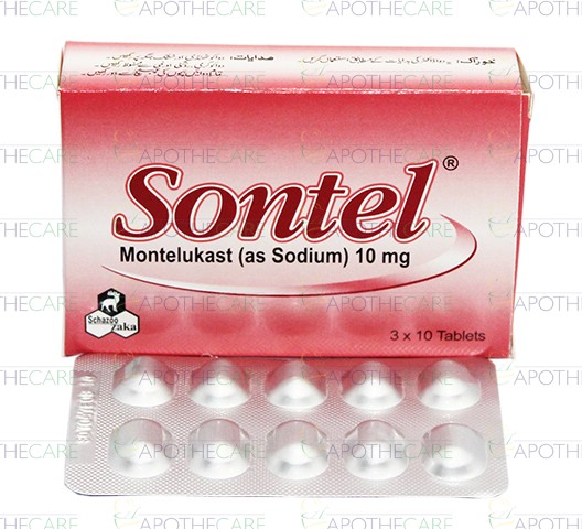 Product Name: SONTEL Tab 10mg 3x10'sProduct Form: TabletsPack Size: 3x10'sMarketed By: SCHAZOO ZAKA (PVT) LTDGeneric Category: Anti-LeukotrieneIngredients: Montelukast
