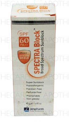 Product Name: Spectra Block 60SPF Cream 40gProduct Form: CreamPack Size: 40gMarketed By: JenPharm Life SciencesGeneric Category: Sun BlockIngredients: