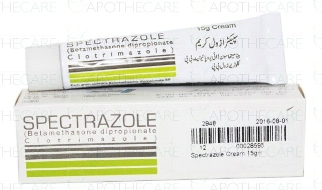 Product Name: Spectrazole Cream 15gmProduct Form: CreamPack Size: 15gmMarketed By: PHARMA HEALTH PAKISTAN (PVT.) LTDGeneric Category: ANTI-FUNGAL + CORTICOSTEROIDIngredients: Betamethasone Dipropionate 0.05%, Clotrimazole 1%