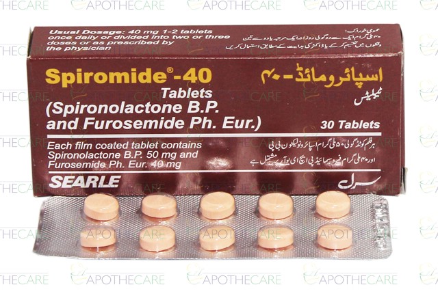 Product Name: Spiromide-40 Tab 30'sProduct Form: TabletsPack Size: 30'sMarketed By: SEARLE PAKISTAN Generic Category: DiureticIngredients: Spironolactone 50mg + Frusemide 40mg
