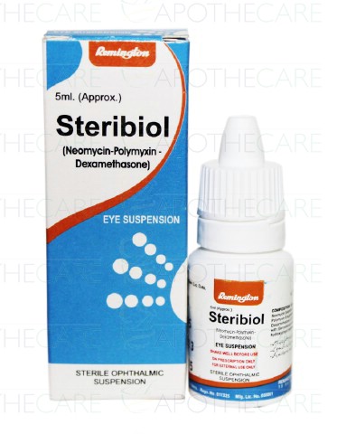 Product Name: Steribiol Eye Susp 5mlProduct Form: Ophthalmic SuspensionPack Size: 5mlMarketed By: Remington PharmaceuticalsGeneric Category: Corticosteroids, Anti-bacterialIngredients: Polymyxin B (Sulphate) 6000IU/ml, Neomycin 0.5%, Dexamethasone 0.1%