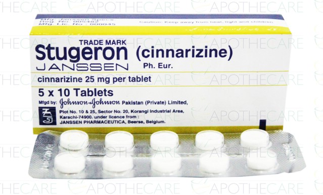 Product Name: Stugeron Tab 25mg 50'sProduct Form: TabletsPack Size: 50'sMarketed By: Aspin Pharma formerly Janssen-CilagGeneric Category: Calcium Antagonist With Cerebral ActivityIngredients: Cinnarizine