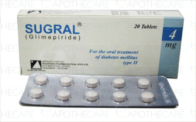 Product Name: Sugral Tab 4mg 20's Product Form: TabletsPack Size: 20'sMarketed By: Rakaposhi PharmaceuticalsGeneric Category: Oral HypoglycemicIngredients: Glimepiride