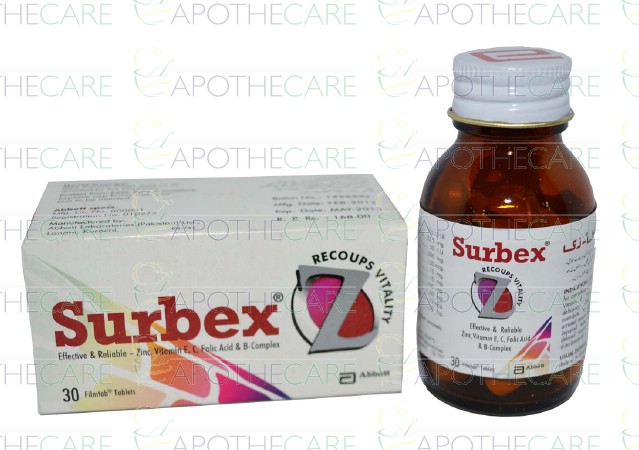 Product Name: Surbex-Z Tab 30'sProduct Form: TabletPack Size: 30'sMarketed By: ABBOTT LABORATORIES (PAKISTAN) LTDGeneric Category: VITAMIN SUPPLEMENTIngredients: Nicotinamide 100mg, Vitamin B2 15mg, Thiamine HCl Vitamin B1 5mg, Vitamin E 30IU, Zinc Oxide 22.5mg, Ascorbic Acid 500mg, Cyanocobalamin 12mcg, Folic Acid 150mcg, Pyridoxine 20mg