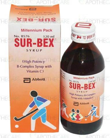 Product Name: Surbex Syp 120mlProduct Form: SyrupPack Size: 120mlMarketed By: ABBOTT LABORATORIES (PAKISTAN) LTDGeneric Category: VITAMIN SUPPLEMENTIngredients: Each 5ml contains: Nicotinamide 50mg, D-Pantothenol 10mg,Vitamin B2 6mg, Vitamin B1 10mg, Ascorbic Acid 100mg, Calcium Pantothenate 10mg, Cyanocobalamin 10mcg Pyridoxine 10mg/5ml