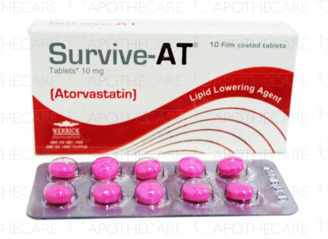 Product Name: Survive-AT Tab 10mg 10'sProduct Form: TabletsPack Size: 10'sMarketed By: Werrick PharmaceuticalsGeneric Category: StatinsIngredients: Atorvastatin