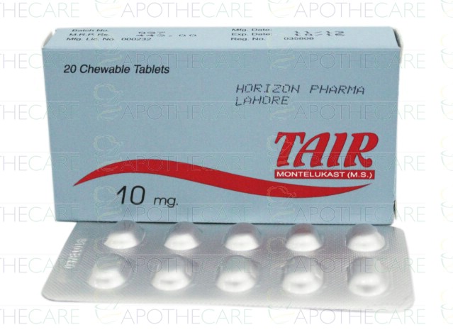 Product Name: Tair Tab 10mg 2x10'sProduct Form: TabletsPack Size: 2x10'sMarketed By: Wilshire Laboratories (Pvt) LtdGeneric Category: Anti-LeukotrieneIngredients: Montelukast Sodium